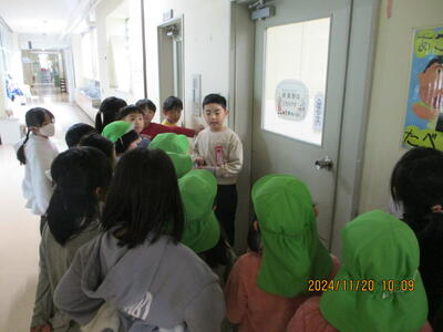 図工室・図書室・体育館・保健室・給食室・音楽室を子供たちが説明しながら回りました。
