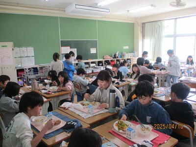今日から給食が始まります。新しいクラスで食べる初めての給食。「おいわいこんだて」でおいしい笑顔が教室いっぱいに広がっていました。