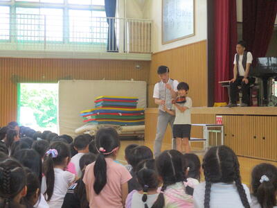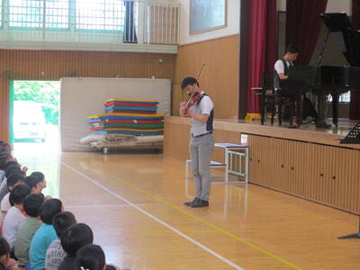 1年生から4年生がエバリーさんのピアノとバイオリンによる演奏を鑑賞しました。 トルコ行進曲、カノン、マンボ、ディズニーメドレーなど、おなじみの曲を楽しく聞かせていただいたり、体験コーナーがあったりしました。