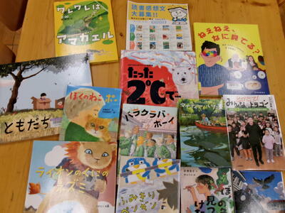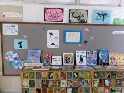 雨で外に遊びに行けないときは図書室で読書もいいですね。季節の本が紹介されており、課題図書も新しく入っています。