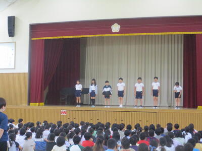 本日の児童集会は各委員会の委員長の発表です。各委員会(代表・運動・給食・図書・環境・放送・保健)の紹介とお願いを発表しました。栄小をよりよくするために1年間、よろしくお願いします。