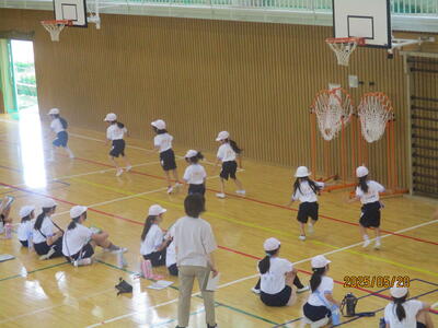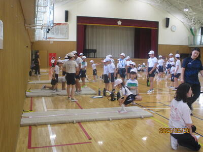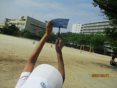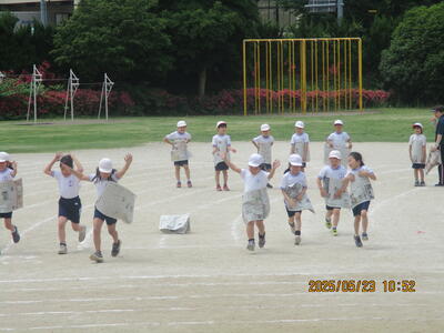 2年生の体育です。新聞紙が落ちないように、体の使い方を考えながら走ります。みんな笑顔いっぱいでした。