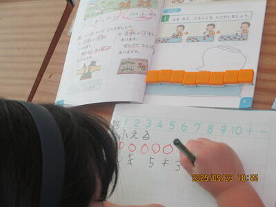 1年生の授業です。たし算の学習に楽しく、真剣に取り組んでいました。ノートに書くことも上手になっています。