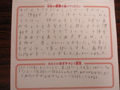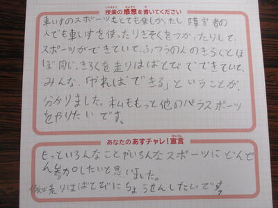 👨🦽4年生 あすチャレスクール 投稿: ルーム管理者 (10/31) カテゴリー: 授業 4年生があすチャレスクールで、パラアスリートの方と一緒に学びました。 一緒にバスケットボール用の車いす体験をしたり、スポーツを楽しむ良さを教えていただいたり、たくさんの学びがあった2時間でした。子供たちの感想を載せますので御覧ください。 -