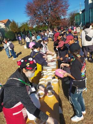 PTAは町会の方々が朝早くから準備してくださったお餅と豚汁を皆さんにお渡しする担当でした。