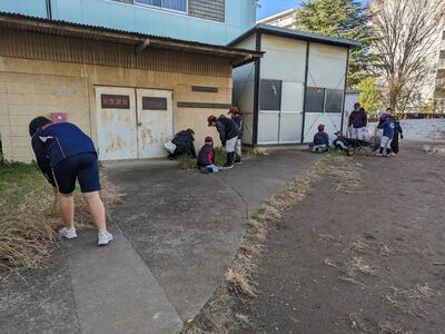 雑草の除去や倉庫の片付け等、定期的に行って下さるのは、学校応援団「ゴールデンルーキーズ2015」栄小学校、池田小学校を拠点に活動する学童野球チームです。厳しい練習のかたわら、校内の環境美化に協力して頂いています。