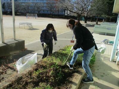 先生方と協力し、芝生の手入れや、厚生委員さんの植え替えのお手伝いなどを行っています。