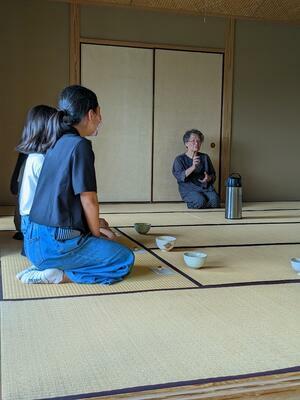 茶道を体験することで、普通のお茶を出された時もその作法が変わってくる、お茶はカテキンもたくさん含まれていて、健康にも良い。そのようなお話の途中で「あ?足が痺れた?大丈夫?」と先生。